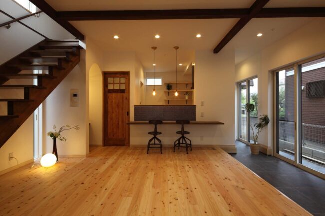 そのすぐれた桧の耐久性を活かす断熱材がセルロースファイバーです。吸放出をする自然素材の断熱材セルロースファイバーは壁の中で結露を起こさず、優れた、断熱性能を発揮します。このような構造材が心地よい木の家を実現します。また、内装においても、自然素材にこだわっております。床材は全室、無垢のフローリング、壁は吸放出性能の高い漆喰壁と一部薩摩中霧島壁を使っており、いつも室内はきれいな空気です。