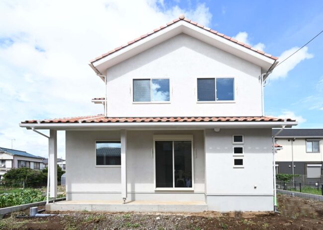 外観は瓦屋根と白い塗り壁が美しい南欧風。やわらかな光と自然素材が調和する上質な住まいです。