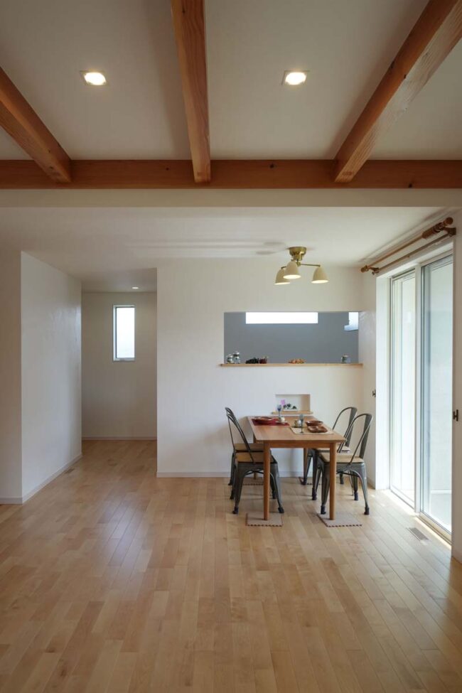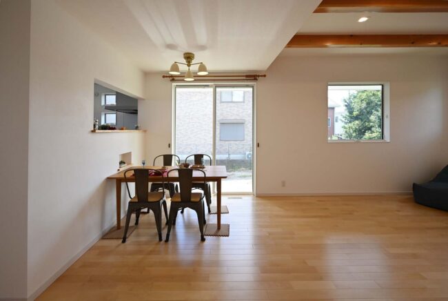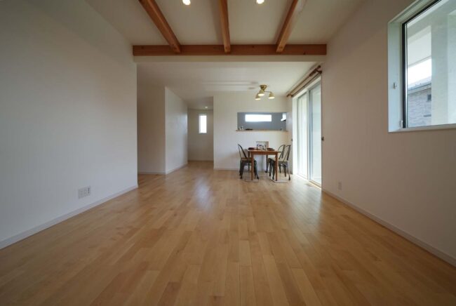 リビングは明るいカバの無垢床に、現しの梁が美しく調和したナチュラルな空間。