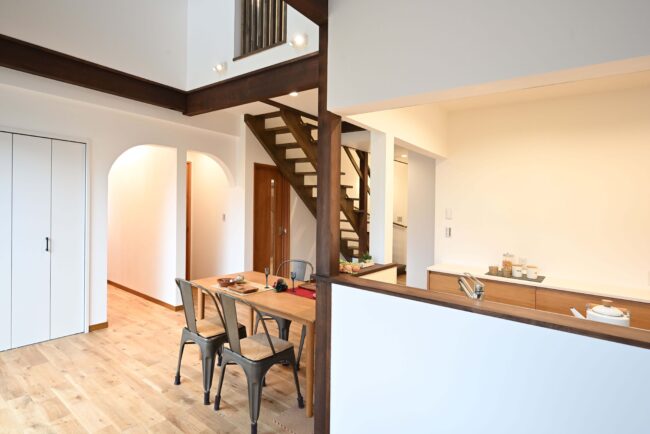 ダイニングは吹き抜けとなっており、たっぷりの光が降り注ぐ明るく開放的な空間です。