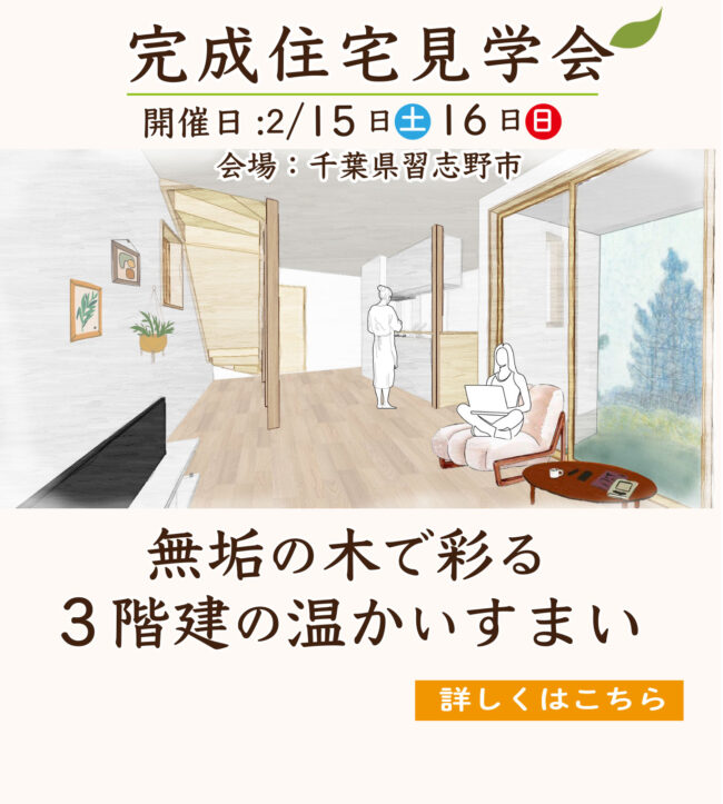 3月20日(祝日), 21日(土), 22日(日)は千葉県印西市で完成住宅見学会を開催いたします。 >>