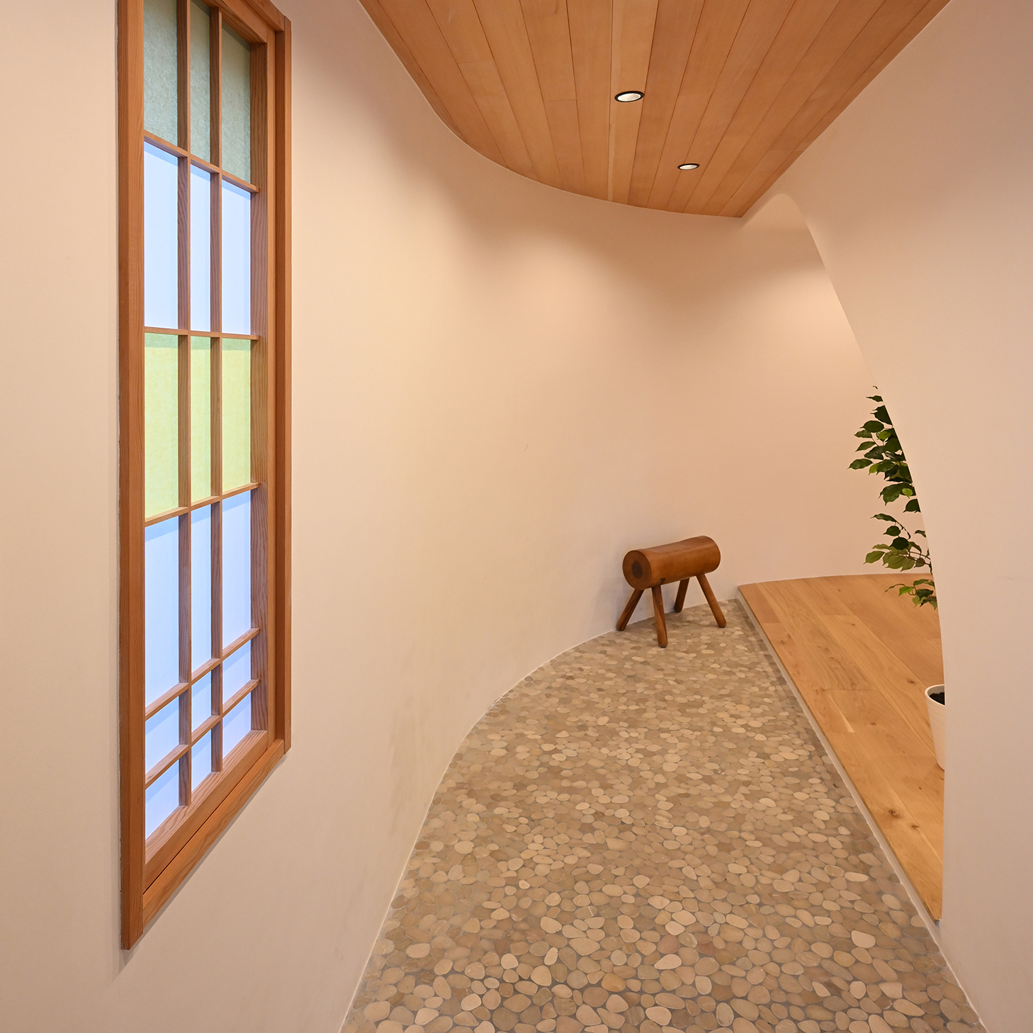 玄関に入ると迎えてくれるのは、大きなRを描いた漆喰の壁。漆喰ならではの美しさと、清らかな空気感をぜひ体感してください。