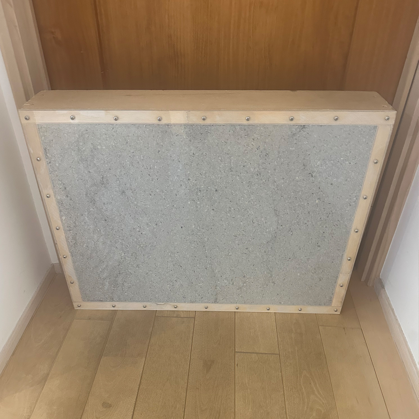 自然素材の断熱材「セルロースファイバー」を壁いっぱいに吹き込んだ模型。高い断熱性に加え、防音効果も体験していただけます。