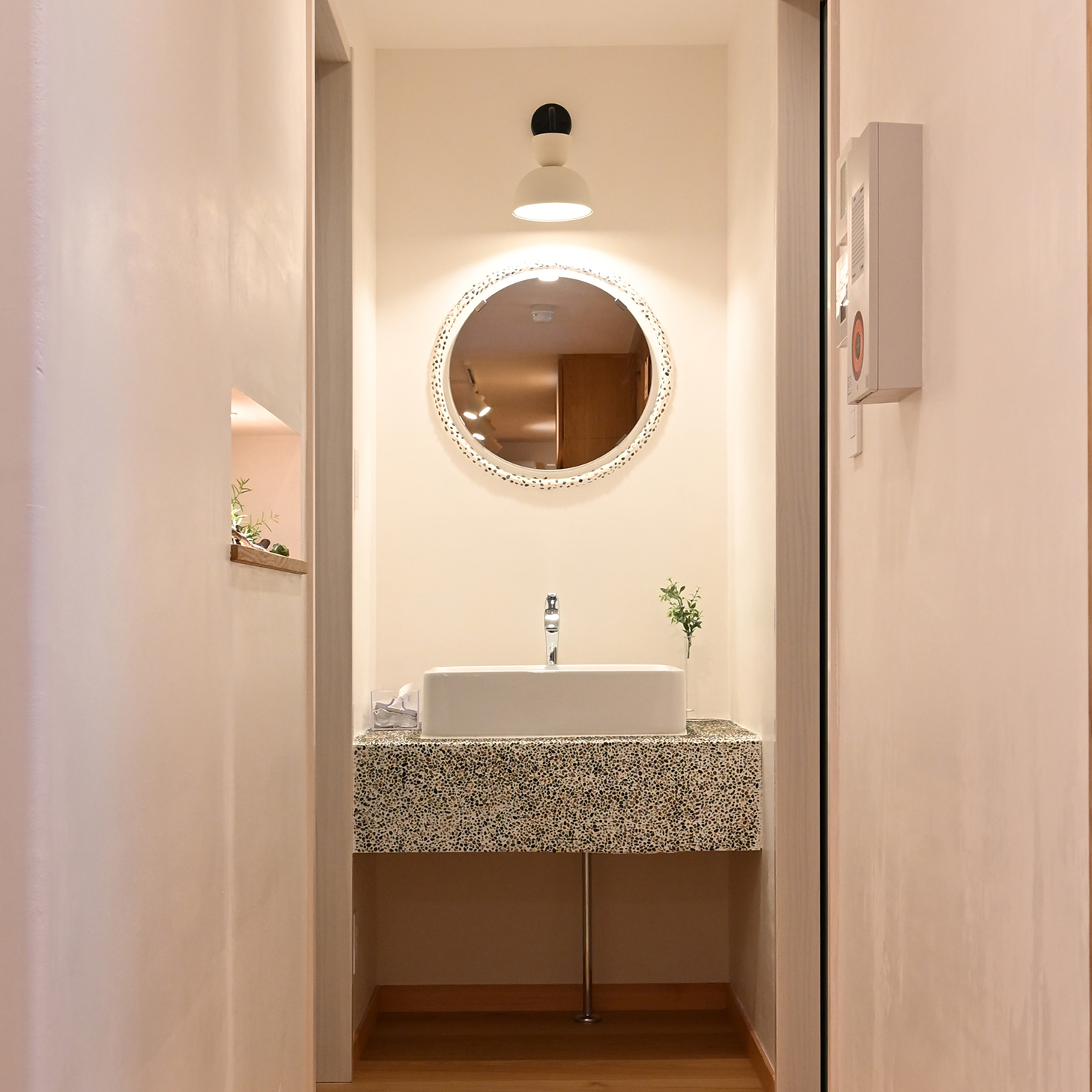 洗い出し仕上げの造作洗面台。毎日使う場所だからこそ、素材やデザインにこだわり、自分らしい暮らしを想像してみてください。