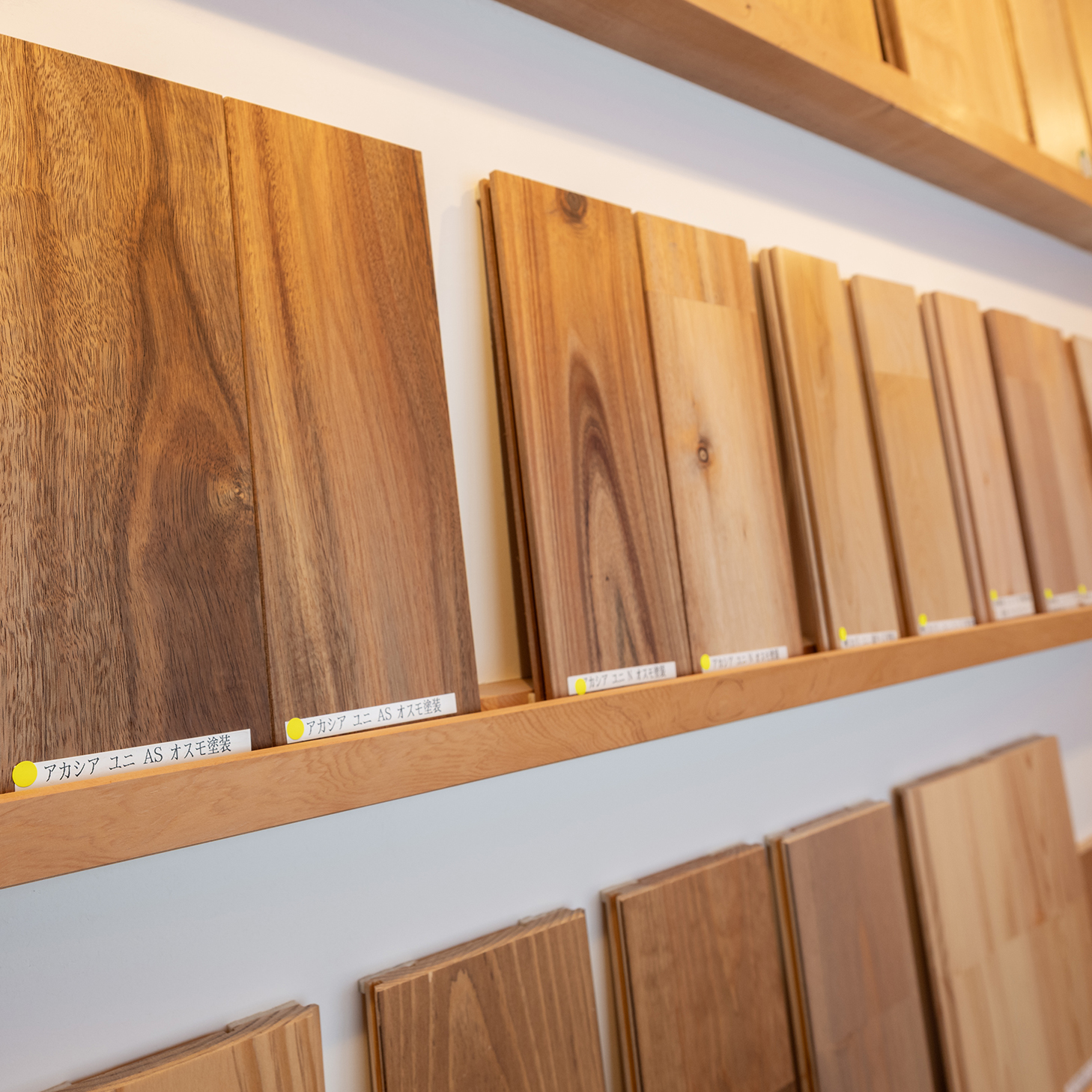 豊富に揃えた無垢床サンプルを展示。色や木目の違いを比べながら、お好みの素材を選べます。素足で感じる温もりと心地よさを体験ください。