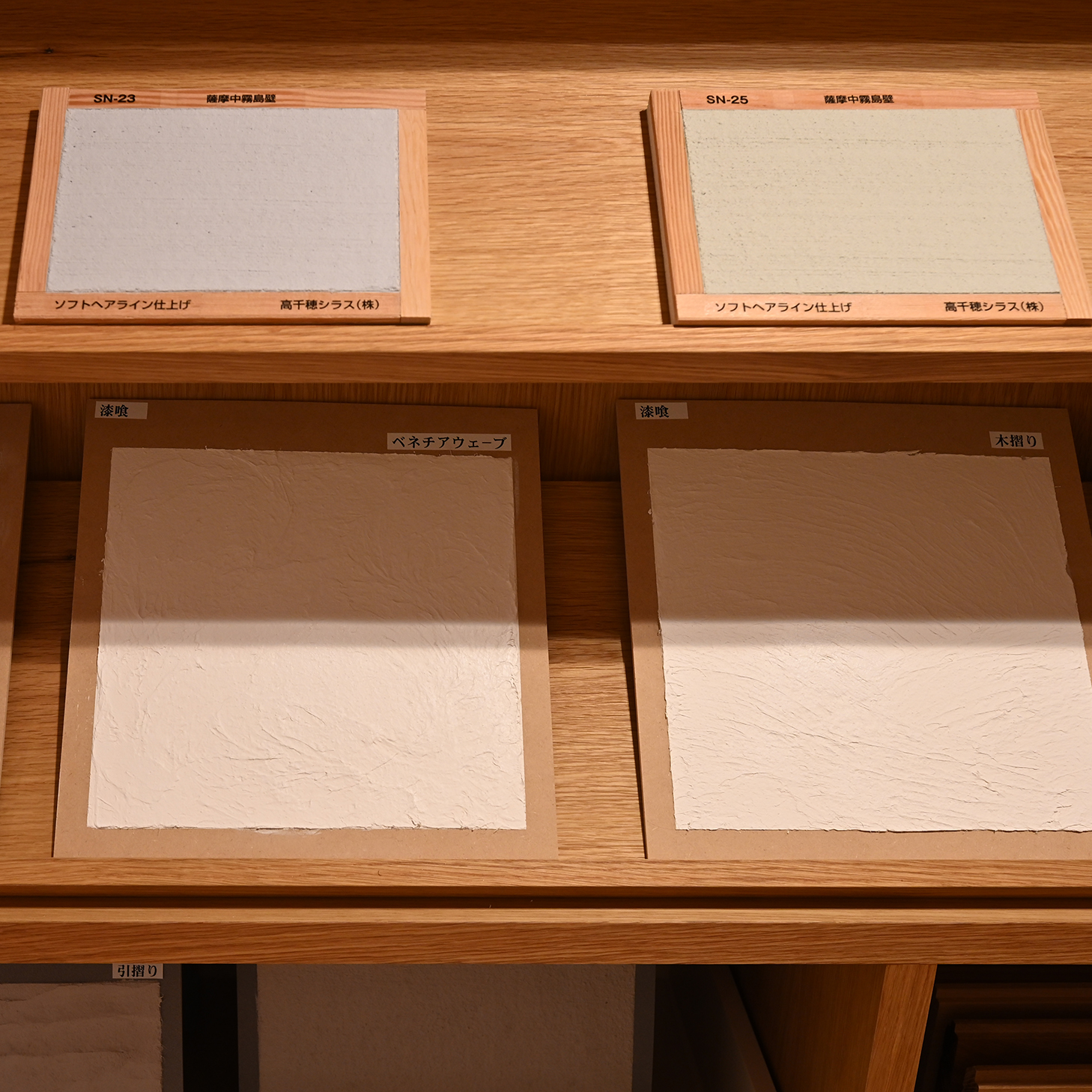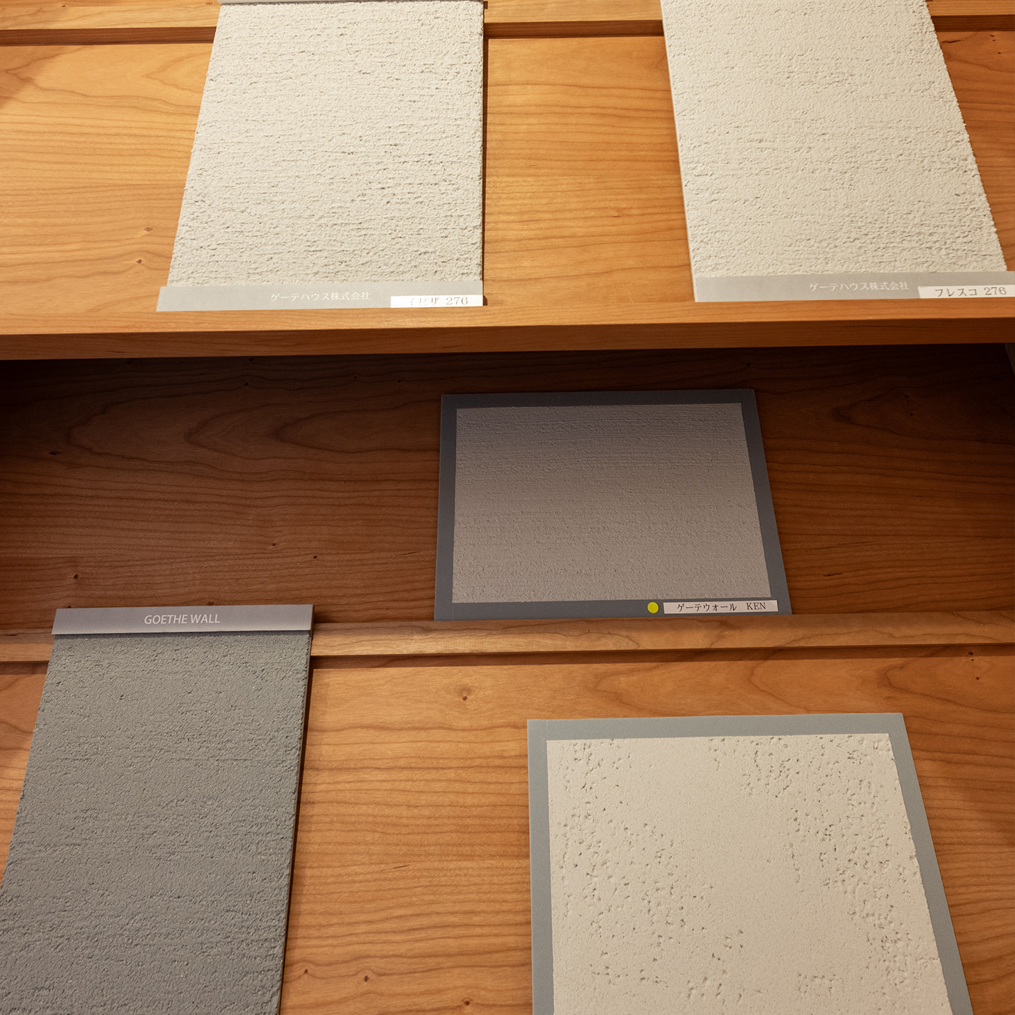 自然素材の壁材を見比べながら、色や塗り方の違いを確認できます。空間の雰囲気を左右する大切な要素を、実際に体感してください。