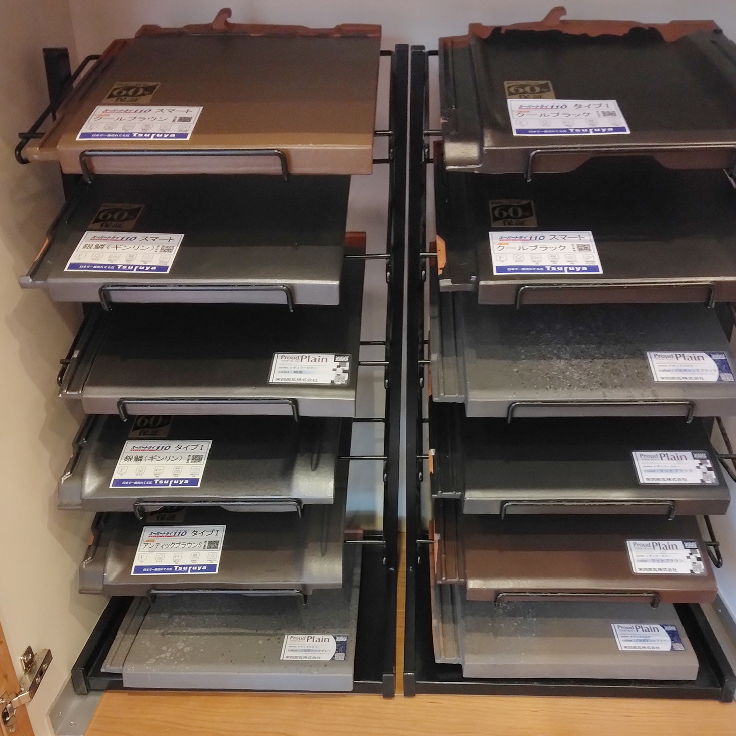 瓦の形や色のバリエーションを展示。外壁サンプルと組み合わせながら、外観のトータルコーディネートを考えられます。