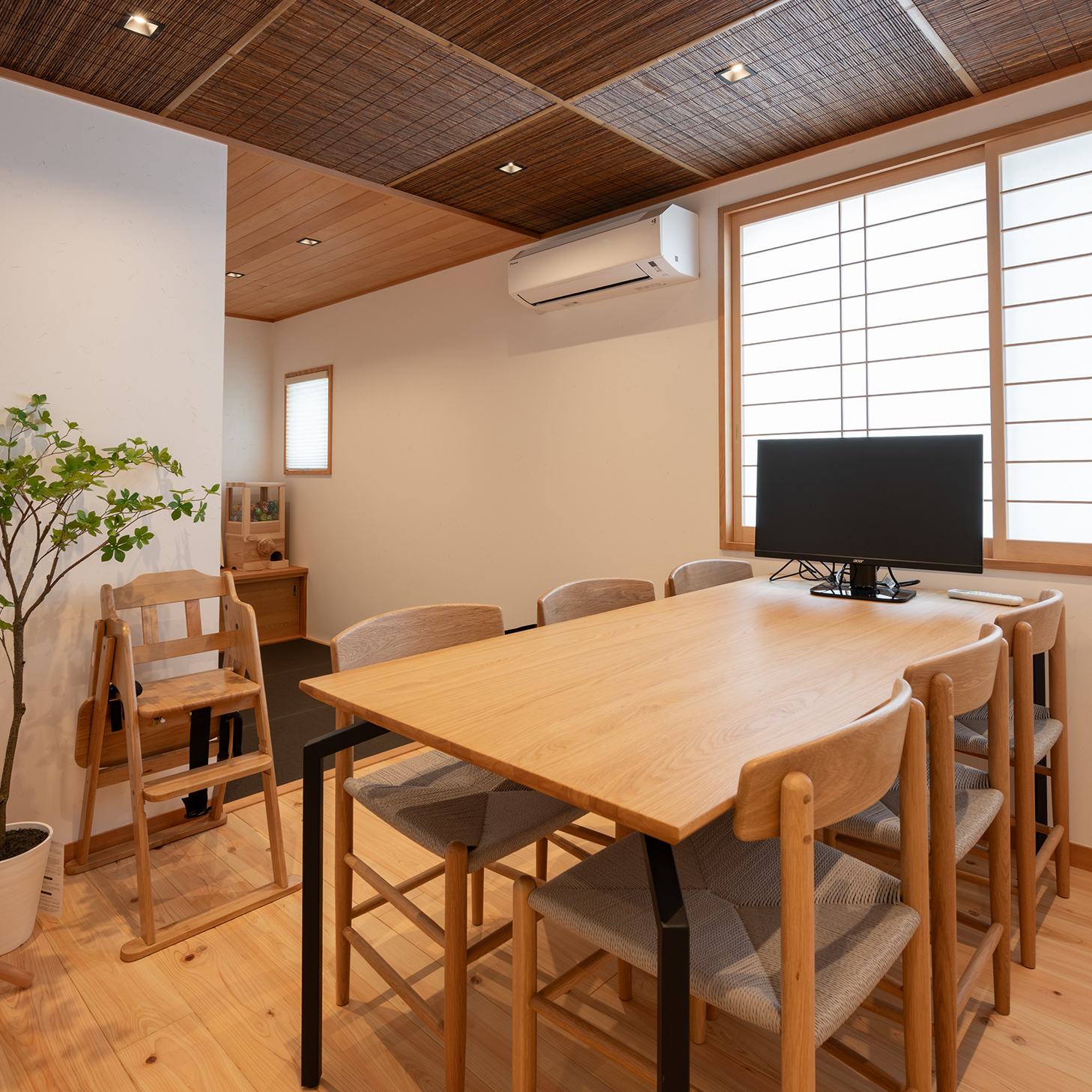 桧の床を使った明るい個室。キッズルーム仕様の小さな和室も併設。天井には萩、壁には薩摩中霧島壁を使い、和の趣を感じられます。