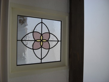 お客様から支給して頂いたステンドガラスを玄関の小壁に配置しました。