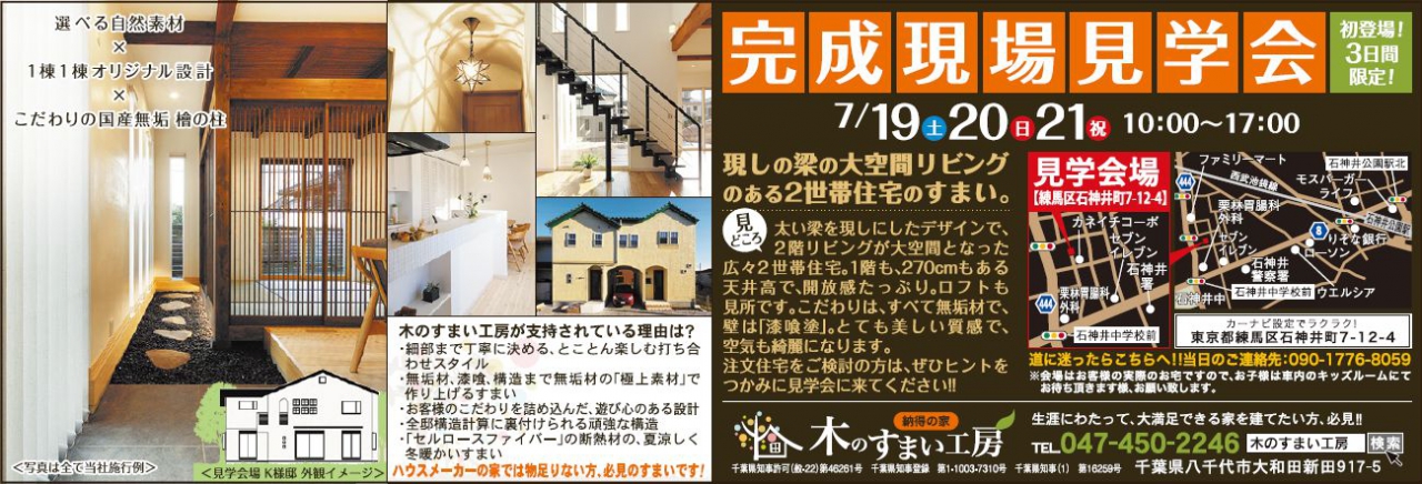 東京都練馬区での見学会が、この3連休(7月19日・20日.21日)、石神井で行います。駐車場も用意しておりますので、ぜひお気軽にお越しくださいね!!
