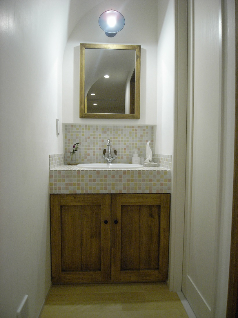 img_5479当社ショールーム、トイレ内の小さい洗面台です。無垢カウンターにタイルの立ち上がりがアクセントです。