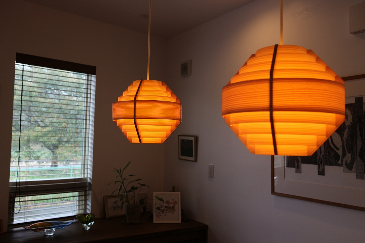 img_2489薄い木を使ったの照明器具です。ヤコブセンのデザインです。木を通した優しい灯りです。