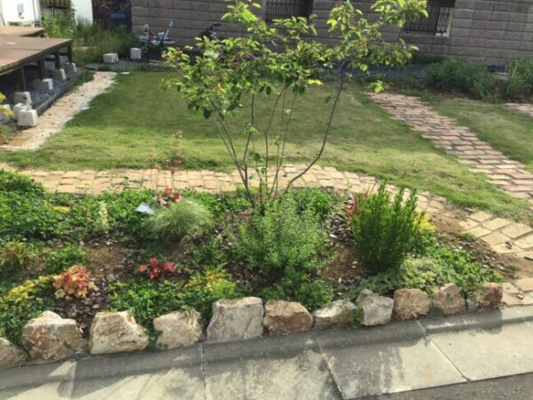 イングリッシュガーデンの雰囲気を目指していたので、煉瓦を敷き詰め、最終的にはこんな感じの仕上がりになりました。